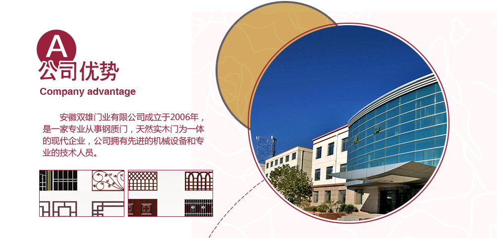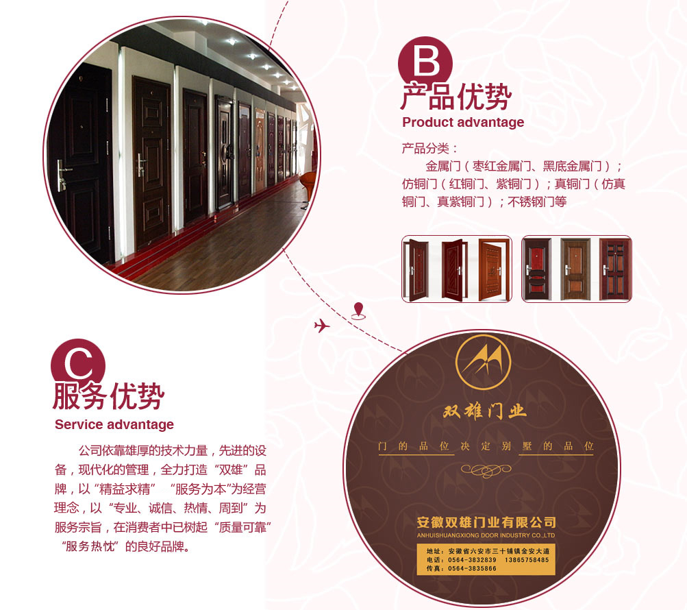 安徽六安雙雄門業(yè)有限公司成立于2006年,是一家專業(yè)從事鋼質(zhì)門,天然實(shí)木門為一體的現(xiàn)代企業(yè),公司擁有先進(jìn)的機(jī)械設(shè)備和專業(yè)的技術(shù)人員,以科技為依托,以市場(chǎng)需求為導(dǎo)向,大膽創(chuàng)新追求更好,全身致力于提高門業(yè)裝飾水平。公司擁有先進(jìn)的機(jī)械設(shè)備和專業(yè)的技術(shù)人員,以科技為依托,以市場(chǎng)需求為導(dǎo)向,全力打造“雙雄”品牌門!產(chǎn)品種類繁多:金屬門(棗紅金屬門、黑底金屬門);仿銅門(紅銅門、紫銅門);真銅門(仿真銅門、真紫銅門);不銹鋼門等。公司依靠雄厚的技術(shù)力量,先進(jìn)的設(shè)備,現(xiàn)代化的管理,全力打造“雙雄”品牌,以“精益求精”“服務(wù)為先”為經(jīng)營理念,以“專業(yè)、誠信、熱情、周到”為服務(wù)宗旨,在消費(fèi)者中已樹起良好企業(yè)形象。
